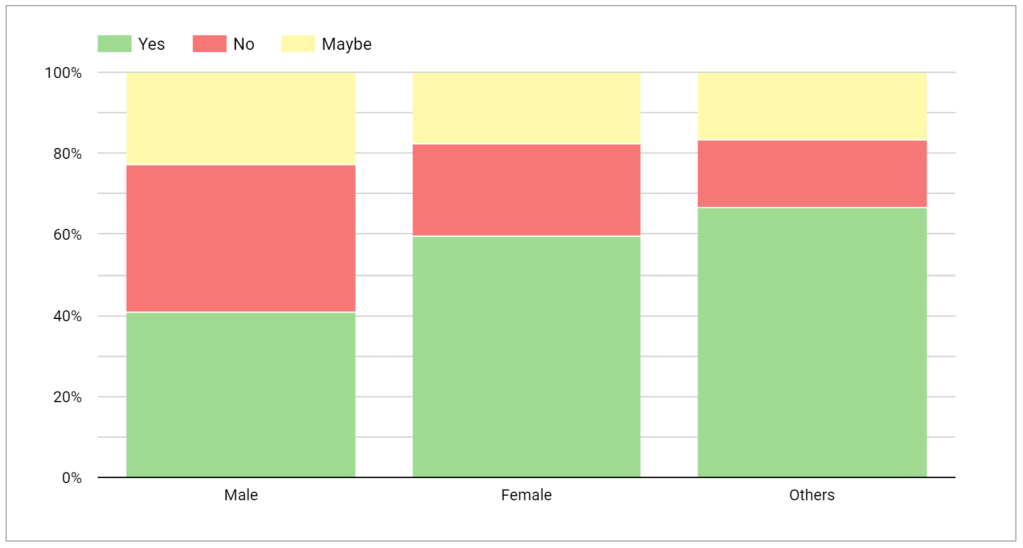 It’s sad that the above really represents how much society has shaped the mindset of most people. As a Male, I think the reason for the above result is clear. only 49% of men have tried to get help and it is sad to see this, I think these numbers should serve as a compass to any HR personnel or upper management. 68% of women have sought help which is quite a lot compared to the sample size and I think that is excellent! Others are also willing to seek help as 75% have sought help.