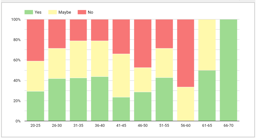 What insight can you draw from the above? The younger generation (20-25) seems less willing to talk about it and also the old generation (46-50). Why could this be? As someone that falls into the younger generation, I would say the following could be factors: